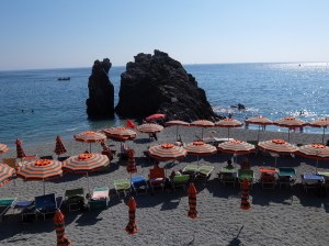 Monterosso old town is adorable. Sue liked it better or almost better than Vernazza. Not me! There were many shops and restaurants and gelaterias. The beach was crowded with people and umbrellas. Imagine the south of France.