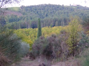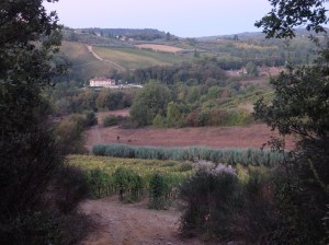 Slow going up the steep streets to catch the trail heading out of town, and 30 minutes later we were outside the town gates and onto the highway. We walked along the road as the sun colored the sky. San Gimignano was behind us with signs noting the gorgeous views and benches to sit and enjoy, but it was too dark for a photo. I still enjoyed but have nothing to show for it. This is one of those “close your eyes” to remember moments.