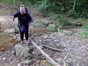 Into the woods we came upon a small creek that had to be crossed. It was rather precarious. Suzanne wasn’t sure if she could do it but she made it with the help of her walking sticks. Those sticks were the best purchase so far!