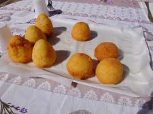 The shirtless host who first invited us over handed us a small cup of Chianti and pointed to the large tray of arancini (delicious rice balls filled with peas, sauce and cheese). We shared one and it was delicious!