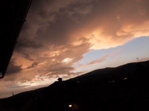 We have About 5 miles or less to go today so I let Sue sleep in a little. I woke up early to a stunning view. The sun was just coming up and the view from our window was fabulous! I want more of that! I did notice those dark clouds. It is not supposed to rain today but…