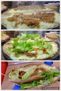 The crepe was delicious. Egg, cheese, spiced ground beef, potatoes, tomatoes and lettuce. Excellent! There are two in the photos as we each had one. We asked if we could share and he said no. They do fold them a certain way but we could have easily shared…