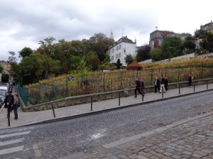 The rain had started so we carefully hustled down the mountain (Montmartre – the mountain of martyrs) and ran into stairs as part of our route back to Metro. Poor Suzanne! At the end of the day we had walked 33 floors and 6 miles with a lot of standing around and a 2-hour bus tour. Tomorrow will have more walking I do believe!