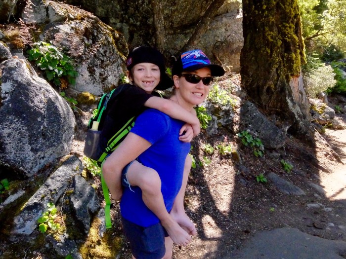 When we found a nice shady spot we took one more turn at wringing our socks out. At this point Alden said his feet hurt so we checked to make sure there were no blisters. Nothing suspicious however his feet were wet and wrinkly. Stef was afraid his callouses would tear (Mr. Rock Climber’s feet) so she bravely put Alden on her back and carried him for 30 minutes.