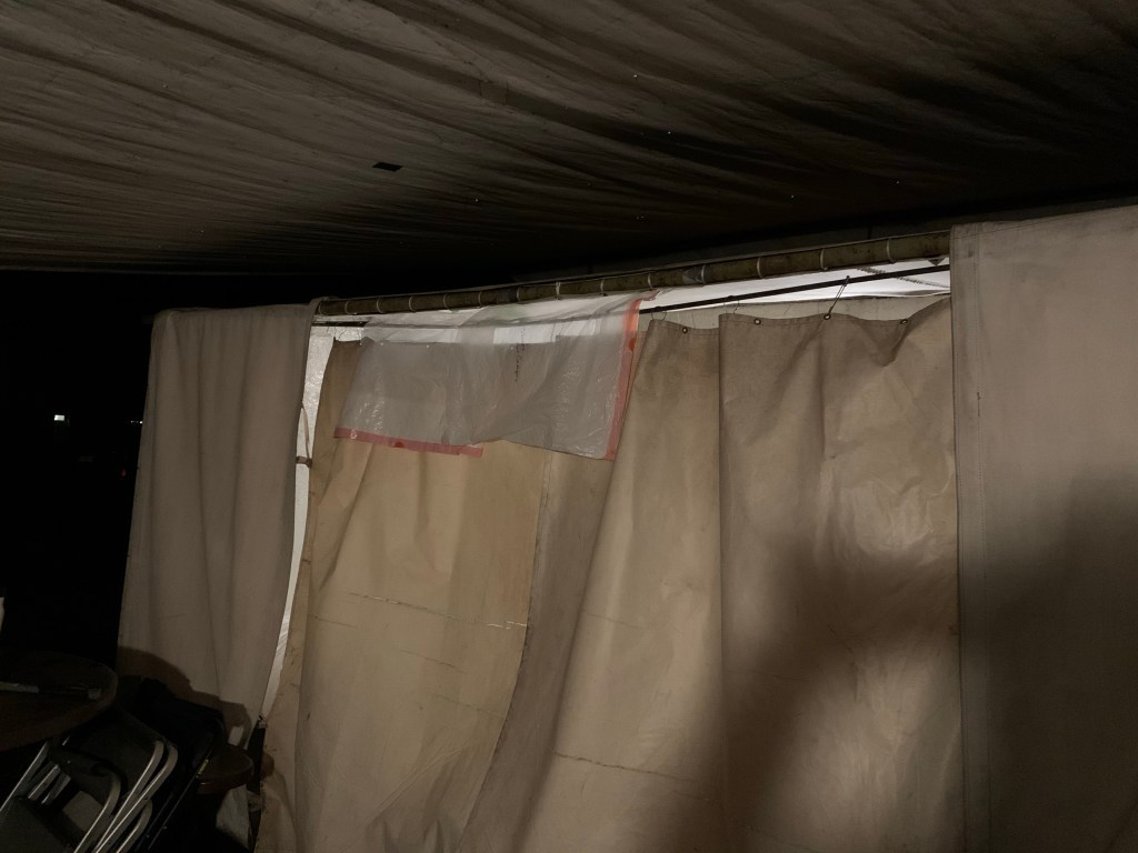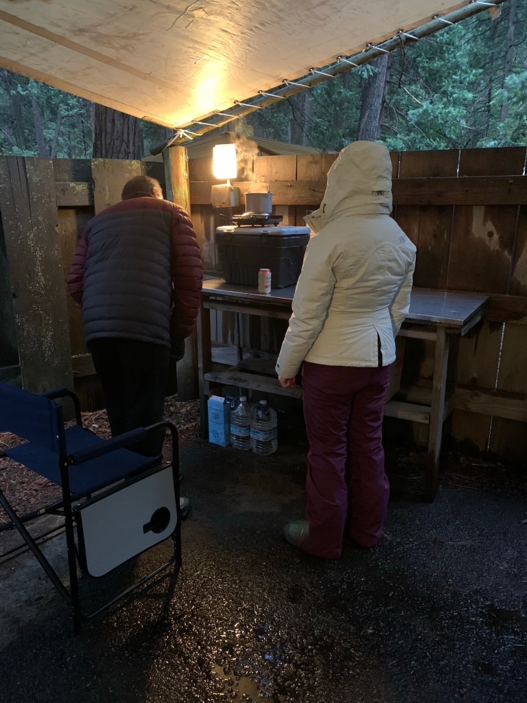 We checked into Housekeeping Camp. Each unit is comprised of 3 cement walls and a tarped wall, similar to shower curtains. We had the unfortunate luck to have our patio with lots of pin holes so with the rain, it was quite wet!