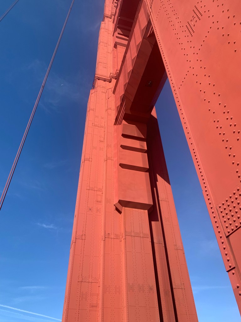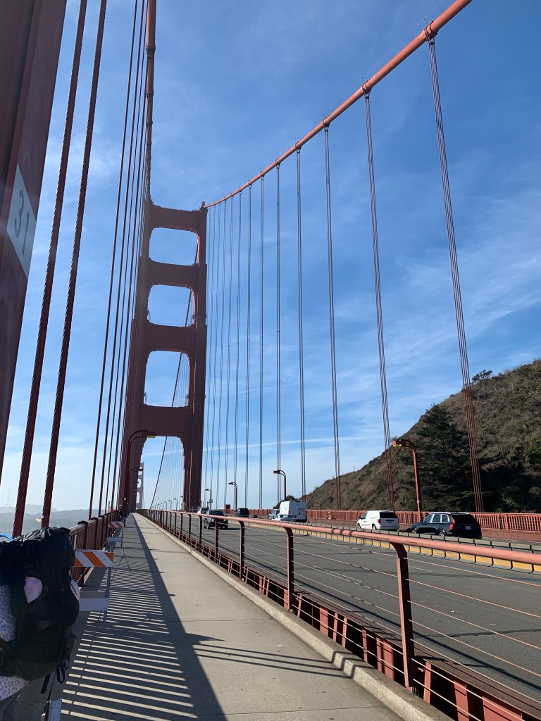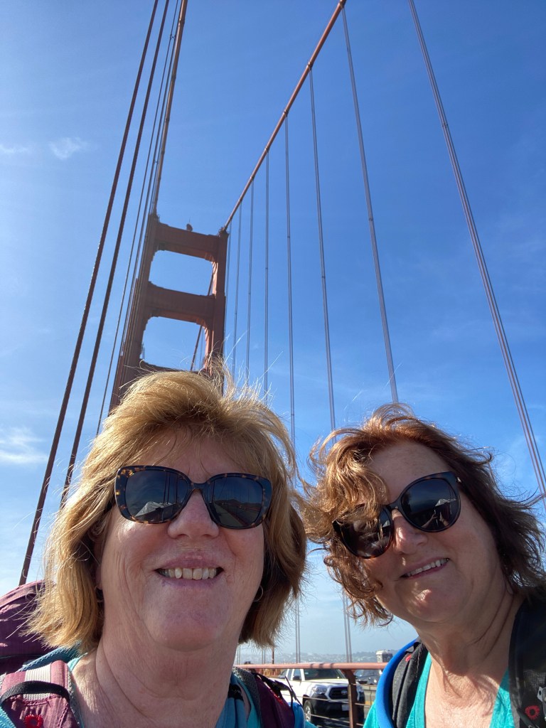 What a beautiful day! Blue skies, calm winds and no jacket required. Knowing we were crossing the notoriously windy Golden Gate Bridge, I stowed my hat and wore my sweatshirt for the first half hour. Had to take it off!