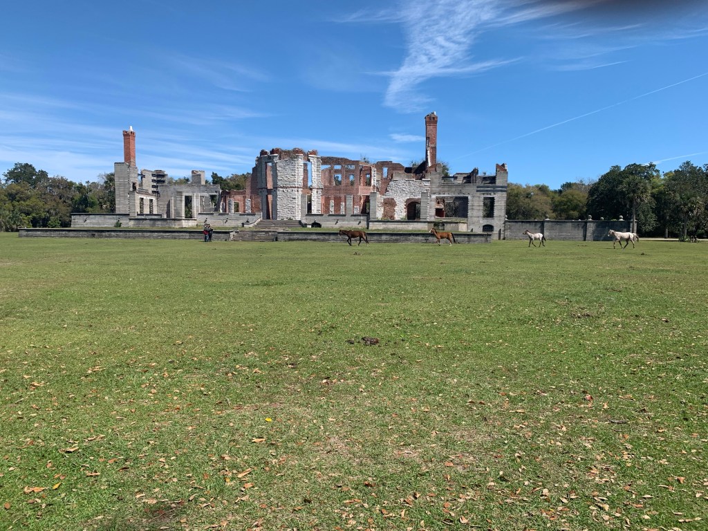 The Island was first inhabited 4,000 years ago by native peoples, then during the 16th and 17th centuries by missionaries, and in a more modern/socialite era by Nathaneal Greene, a Revolutionary War hero, and his wife Catherine Littlefield Greene. Nathaneal died before their home was built, and later, Catherine married Phineas Miller. Together they helped Eli Whitney develop the cotton gin. Eventually by the late-1800’s the Carnegie family purchased land, and a 59-room castle was built along with golf course, pools, and housing. After the Crash and Great Depression, they left the island, leaving behind all their property and their horses. Today those horses run wild, which is pretty cool.
