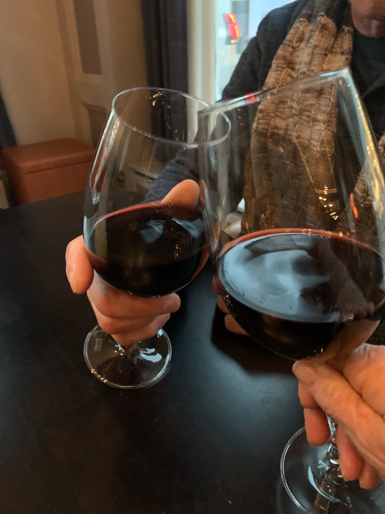 Our hotel includes a social hour (4-6 pm) so we made it just in time for a glass of red. Cheers!