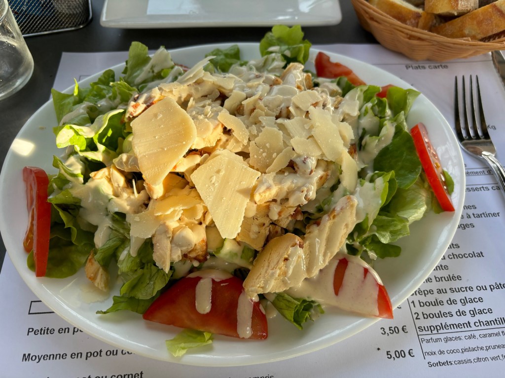 First up was dinner. We tried two restaurants and since we did not have reservations there was no room for us. A third place asked if we reserved and when we said no, he paused but then got out two menus and seated us. Almost no one was on the patio when we arrived but by the time we finished, the place was full. The setting was beautiful and the food a mix. Our salad which was a chicken Caesar, was delicious. We each ordered a ground steak burger which came with fries and no bun. We now know that if you order medium… it will be quite red. Not my cup of tea so medium well it shall be going forward!