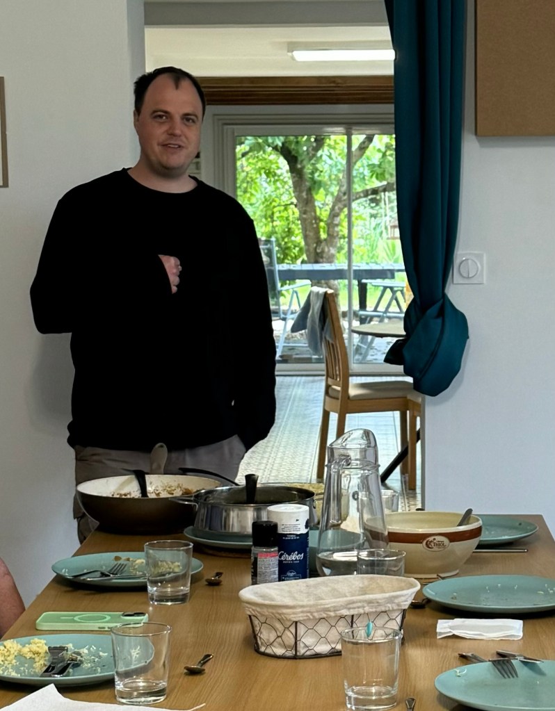 Tracie and I sat at the table far too long chatting with Vincent. He’s an interesting young guy (maybe 35-40). He drove the light rail train in Lyon for 10 years and then Covid hit. He had already walked the entire Camino trail from LePuy-en-velay to Santiago de Compestelle so was familiar with the system and decided to look for a Gite to buy. He seems happy with his decision. However he might need some additional cooking tips…