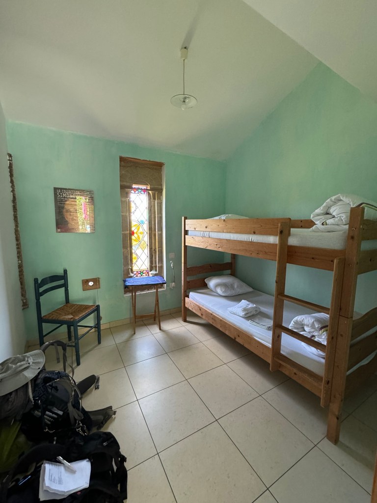 We arrived at our Gite early but Veronique welcomed us and showed us our room. We finally had bunk beds so Tracie is on the top 🤣 The interesting thing about this Gite is that it was rebuilt using some original materials. The stained glass windows are pretty but you can’t open them so they added vents into the walls, very small holes with a cap you can use if you don’t want the air.