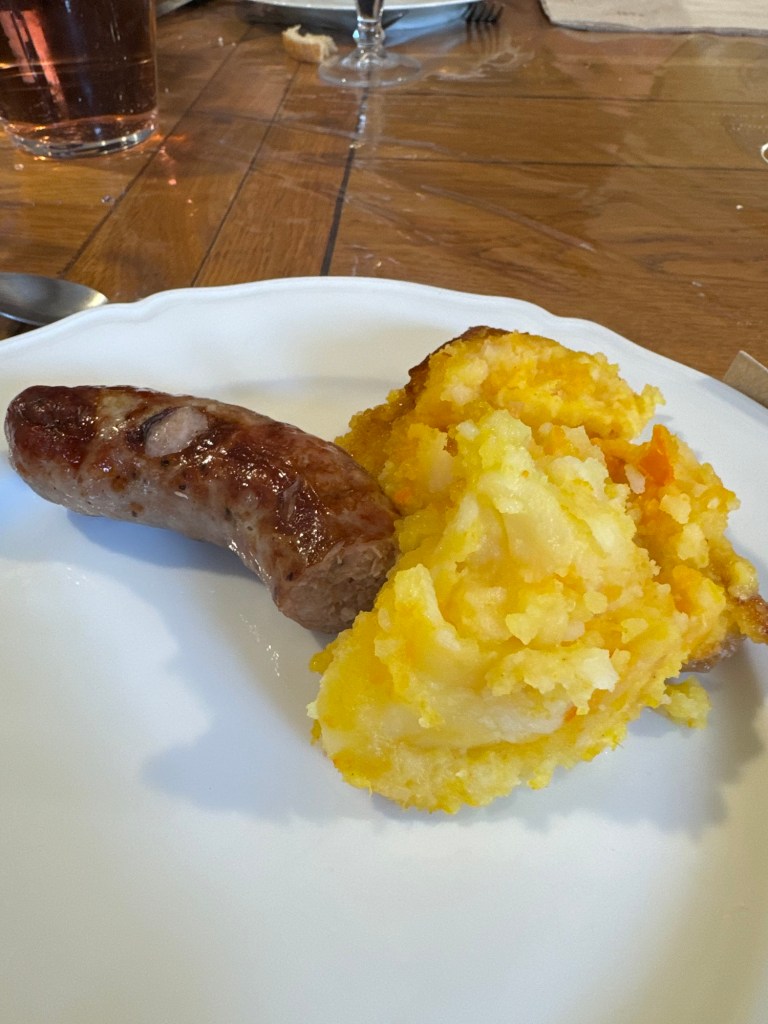 Dinner was creamed potato and pea soup, pumpkin mashed potatoes and sausages, green salad and coffee pudding of some sort. It was all very good.