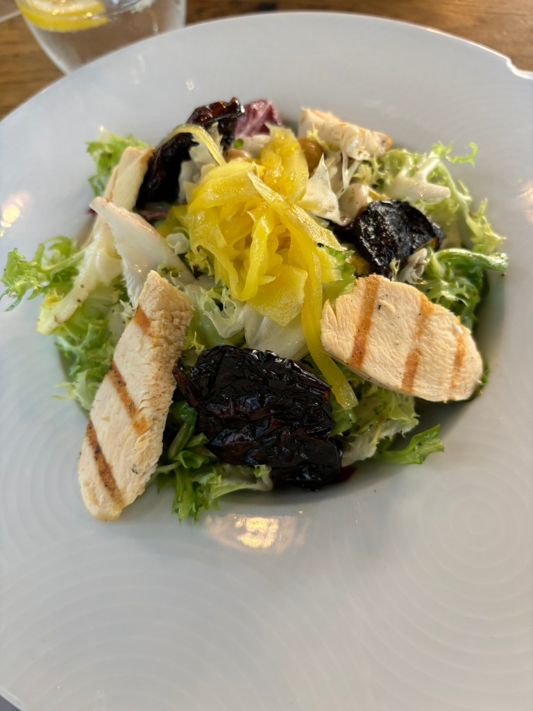 Time for dinner. Even though we walked and climbed today we were both in the mood for a salad. We found a restaurant that offered a chicken salad with fruit and balsamic dressing that sounded good. And it was.