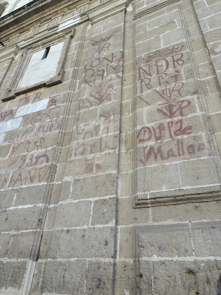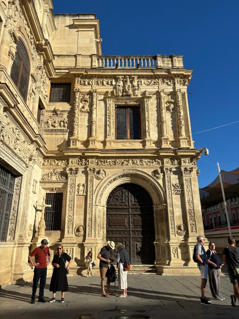 Town HallBuilding refurbished in the 1920’s due to the Latin American Exhibition in 1929. Many buildings were redone around this time period and it was up to each architect as to which style they chose. Mudejer, Renaissance, Gothic, Romantic and Art Deco300-year-old “graffiti” found when the soot was cleaned from many of the older buildings in the 1990’s. This is the Seville Cathedral. Most of this graffiti was from students graduating from the medical school nearbyThe cathedral tower that stood through the earthquakesThe Alcazar – being visited this day by the King of Spain so no entry was possible. We walked into the courtyard the night before!A portion of original wallThe gold tower symbolizing the path to coin exchanges. No gold was ever kept here but apparently sparkles “gold” when the sun hit the tower This building was formerly used to make cigars and is now part of the University. A moat was built around a large portion of the building as it was discovered many of the workers (women) would often come back after hours with their spouse and steal cigars to sell on the streets. Gorgeous tree!Building near the University